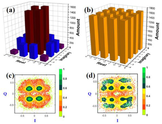 As seen in Figure 6a, the red-brown columns mark the amount distribution of constellation points in the inner ring of PS-16QAM, the blue ones in the middle ring, and the purple ones in the outer ring. The distribution of the transmitted PS-16QAM showed an uneven change with the information entropy. Such an imbalance becomes severe when the information entropy grows smaller. The process of the ROS method is presented here. The information entropy in our experiment was set as 5.6 bit/symbol. First, we oversampled the original unbalanced PS-16QAM training dataset. Thus, the corresponding target output has an equal distribution in Figure 6b. The constellation diagrams of PS-16QAM before ROS could not be fully separated into 16 points in Figure 6c, while in Figure 6d, it is shown that they could be divided into 16 equal parts after ROS.