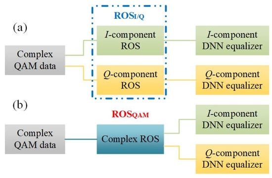 The scheme of TLD equalizers combined with ROS. (a) TLD equalizer combined with ROSI/Q; (b) TLD equalizer combined with ROSQAM.