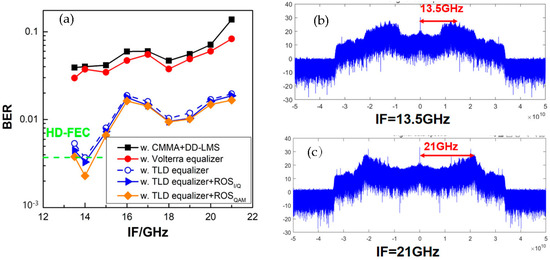 (a) The BER performance vs. the intermediate frequency after down−conversion for 10−Gbaud PS−16QAM signals, and the electrical spectrum when the received IF was (b) 13.5 GHz and (c) 21 GHz.