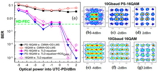 (a) BER performance vs. the input optical power of PD for 88.5 GHz PS−16QAM signals and 88.5 GHz 16QAM signals at 10−Gbaud by employing a 45−tap CMMA equalizer, combined with 301−tap DD−LMS, nonlinear TLD equalizers, and TLD equalizers combined with ROS, respectively. The recovered constellation diagrams of the PS−16QAM signal using TLD equalizers when the input optical power of PD was (b) −4 dBm; (c) −2 dBm; and (d) 2 dBm; and that of the 16QAM signal when the input optical power of PD was (e) −4 dBm; (f) −2 dBm; and (g) 2 dBm.