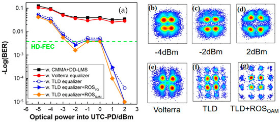 (a) The BER performance vs. the input optical power of PD for 88.5 GHz PS−16QAM signals at 10−Gbaud using traditional DSP algorithms, Volterra equalizers, and different TLD−ROS nonlinear equalizer schemes with MSE loss functions. The recovered constellation diagrams of the PS−16QAM signal after DD−LMS when the input optical power of PD was (b) −4 dBm; (c) −2 dBm; (d) 2 dBm. Different constellation performances of the PS-16QAM signal when the input optical power of PD was fixed at 0 dBm, after (e) the Volterra equalizer; (f) the TLD equalizer; and (g) the TLD + ROSQAM scheme.