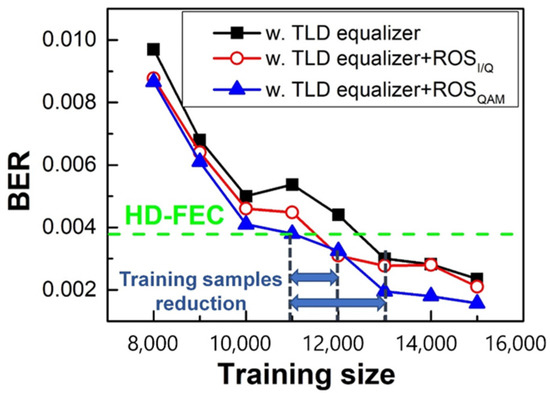 Next, we compared the BER curves of PS-16QAM versus different training sizes of TLD schemes in Figure 11 when the optical input power was fixed at −1 dBm. It can be concluded that a larger training dataset is beneficial to BER reduction, although at the expense of efficient system capacity. Moreover, it was obvious that the BER of PS-16QAM employing the TLD-ROSQAM equalizer performed the best, and it was reduced to below 3.8 × 10−3 when the length of the training set exceeded 11,000. In contrast, the TLD-ROSI/Q equalizer required 1000 extra training samples, and 2000 extra training samples for the TLD equalizer. This means the ROS method is not only helpful for the adequate training of minority categories, but is also superior in training sample reduction. Although the training size was increased based on ROS, the demand for training capacity was decreased. In the following discussion, the training dataset size was set as 11,000 samples.