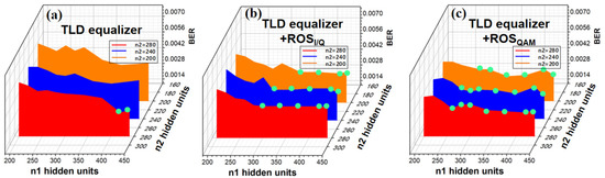 Moreover, we further compare the BER performance with an input optical power of −1 dBm versus the quantities of neural cells n1 and n2 in hidden layer 1 and hidden layer 2, respectively. The quantities of neurons n0 and in the input layer and the output layer were 180 and 1, respectively, for all TLD schemes. Here, the green dots mark the points at which the BER is 3.8 × 10−3. As shown in Figure 13, for TLD equalizers, the minimum data pair is 410 and 280. For TLD-ROSI/Q equalizers, the minimum data pairs are 280–240 or 320–200, and 270–200 for TLD-ROSQAM equalizers. Horizontally viewed from the axis in Figure 13, we can draw from the BER curved surfaces that, when the number of n2 units is fixed, BER generally drops with the increase in n1, although there are slight fluctuations. Likewise, BER curved surfaces show the same trend regarding the increase in n2, vertically viewed on the axis of coordinates. The results imply that the BER performance can be improved by increasing n1 or n2.