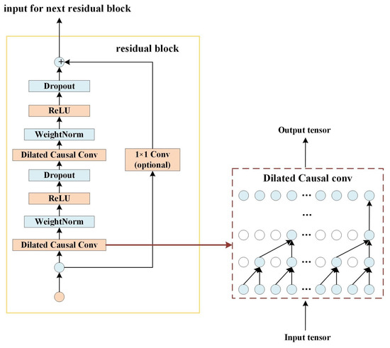 Residual block: After normalizing the weight of the dilated causal convolutions each time, the ReLU function is used to increase the nonlinear relationship between layers, and then a dropout term is added to achieve regularization. In addition, in order to prevent the TCN output from being inconsistent with the length of X, a convolution is performed before the output, so that the TCN can output in the desired dimension.