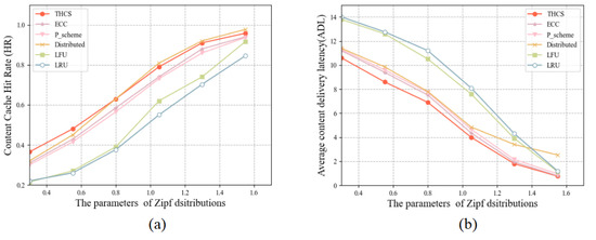 To investigate the relationship between content popularity and cache performance, we changed the content heat distribution by adjusting parameter of the Zipf distribution. As shown in Figure 3, the cache performance improves as the parameters increase. This is because as the parameters become higher, more cache space is allocated to the more popular content. Compared to the ECC strategy, the THCS strategy improved HR by 1–12% and reduced ADL by 5–12.5%.