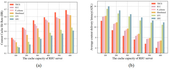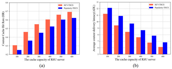 To investigate the effect of cache size on cache performance, we scaled the cache size of each RSU server from 100 to 600. As can be seen in Figure 4, cache performance improves as the cache size increases. The reason is that as the cache capacity increases, more content can be cached on the RSU servers and user requests are more likely to be available in the cooperation area rather than from remote servers. The THCS solution shows optimal performance in terms of both HR and ADL.