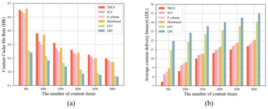 The relationship between cache performance and content quantity: (a) The influence of different content quantity on HR; (b) The influence of different content quantity on ADL.