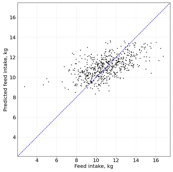 Scatter plot of actual feed intake against predicted feed intake for both CONC and MIXED feeds; with a Root Mean Square (RMS) error of kg. Black points represents a single animal’s actual vs. predicted feed intake; blue line represents a 1:1 prediction.
