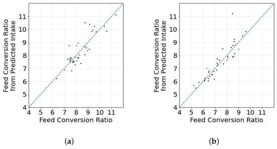 Feed Conversion Ratio (FCR) from estimated intake. (a) MIXED diet. (b) CONC diet. Black points represents a single animal’s actual vs. predicted FCR; blue line represents a 1:1 prediction.