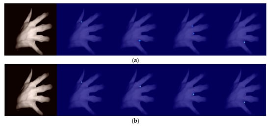 Using a transposed convolutional network model for training, when the fingers were not open enough, they were misjudged to be the next finger, so bilinear interpolation was used for upsampling and then the output heat map was more accurate, as shown in Figure 9.