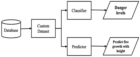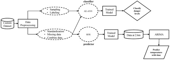 Figure 1 depicts the overview scope of the presented work. This work aims to improve firefighters’ safety during victims’ evacuation from burning sites. This solution develops an algorithm to generate a custom dataset from a database of environmental data captured in a burning area by considering the AESV unit’s possible movements. The solution also uses deep learning (DL) models to classify the burning site into three danger levels and prediction models on environmental data to predict the temperature at heights closer to the ceiling and the effect of time on temperature. The classifiers use the impact and influence of ecological factors on the firefighters’ PPE to classify the danger level of the fire site. At the same time, the predictor forecasts the fire growth at heights closer to the ceiling using environmental data captured at the height of 0.6 m. Time is of the essence in firefighting because firefighters’ PPE and the structural building members deteriorate with time. The longer the firemen or firewomen stay at the fire scene, the higher their chances of getting injured or killed.