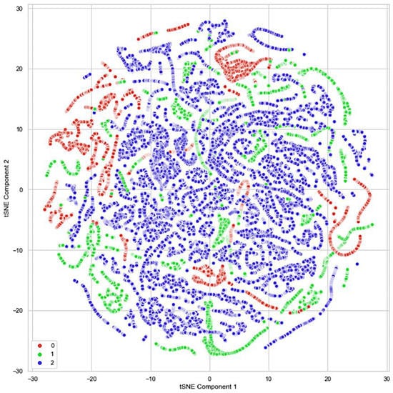 Figure 3 depicts the randomness and instability of the burning site presented in [21]. The plot shows three different clusters representing the three classes of our dataset. The classes are classified as ‘safe’ as zero, ‘caution’ as one, and ‘danger’ as two. The plot showed some overlapping samples between the three classes. This explains how quickly the fire stages change in a burning site. The t-SNE plot brings to our attention that our dataset has overlapping and imbalance problems, which would increase the difficulty of our trained model in distinguishing between the classes present in the overlapping region and lead to the deterioration of the model’s performance [22].