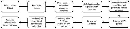 After loading the dataset, fourteen columns were selected, partially comprising one column of smoke, one column of CO, and six other columns, each representing temperature readings at different parts of the burning compartment at heights of 0.6 m and 2.6 m. We assumed the AESV would capture five observations per movement. The number of possible AESV movements is the total number of observations (data length) divided by the number of observations selected per movement. Next, we created a dictionary of the AESV’s current location and where it could move to, considering the layout of the compartment. A new data frame is designed to store the captured data every time the AESV changes position. After randomly selecting the AESV starting point, the first set of five observations was picked. For every iteration (representing AESV movement), five observations were chosen from one of the six positions of temperature readings at heights 0.6 m and 2.6 m and appended in two different columns, titled t°C (0.6 m) and t°C (2.6 m), without picking from the same set of observations twice. The iteration continues until the maximum possible AESV movement is attained. We can generate unlimited datasets for each CLT-Test data to train and test the classifier and predictors by running the algorithm as often as we want. Ten other datasets will be generated from each experiment for this research work.