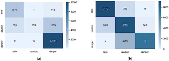 The confusion matrix in Figure 5a,b gives more insight into how the model classifies each class. Figure 5a shows that the model did exceptionally in classifying ‘safe’ and ‘danger’ samples but struggled with ‘caution’. The AE-ANN model trained with an imbalanced dataset could correctly classify only 6% of the ‘caution’ samples.