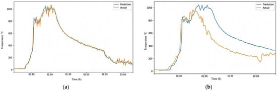 The prediction made by the model was relatively accurate, as shown in Figure 6b, with a correlation of 0.873, an MAE of 167.47, and an RMSE of 206.35. However, the errors would be expected to increase due to the differences between the two fire grounds. The conditions at a fire scene can vary significantly from one location to another and from one time to another, making it invalid to assume that fire behaves consistently. This is especially evident when firefighters move from one room to another. The situation in the new room can be very different from the previous room due to factors such as ventilation and fuel availability.