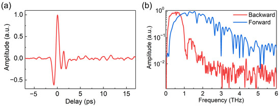 Figure 2. (a) A typical waveform of the backward THz emission. (b) The spectra of the backward (in red) and forward (in blue) THz emission for comparison.