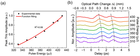In addition, the dependence of the backward THz waveform on the laser pulse chirp was investigated. The chirp of the laser pulse was tuned by adjusting the compression grating in the laser system. The backward THz waveforms as a function of the laser chirp are shown in Figure 4a. When the laser chirp was tuned from positive to negative, the amplitude of the backward THz wave first increased and then decreased, reaching its maximum at a positive chirp near the transform-limit pulse condition, as indicated by the fourth curve from the bottom in Figure 4a. This result is consistent with the dependences of the THz energy on the chirped pulse duration reported in previous works [28,29], which showed that the highest THz energy was achieved using positively chirped laser pulses. Moreover, the laser pulse duration increased with the absolute value of laser chirp, and, consequently, the laser peak power decreased with it, resulting in the temporal shift of the THz waveform caused by the nonlinear-focusing effect, as shown in Figure 4a. The temporal shift of the THz waveform can be roughly fitted by the curve derived from Equation (3) by changing the pulse duration (τ) at a fixed pulse energy of 430 μJ, as shown by the black dashed line in Figure 4a. Bedsides, in order to show the dependence of the THz spectrum on the laser chirp, the Fourier transform spectra of the THz waveforms are illustrated in Figure 4b. When the laser pulse duration increased with the absolute value of laser chirp, the bandwidth and central frequency of the backward THz spectrum decreased, as shown in Figure 4b.