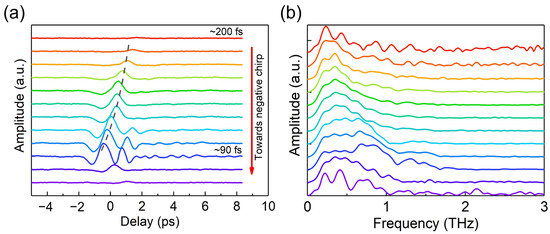 Figure 4. (a) THz waveform as a function of the laser pulse chirp. The pulse duration tuned by the laser pulse chirp varied from ~90 fs to ~200 fs. The pulse duration of the transform-limited pulse condition was ~90 fs, corresponding to the THz waveform shown by the dark blue curve. (b) The corresponding Fourier transform THz spectrum as a function of the laser pulse chirp. The colors of the curves correspond to those in (a).