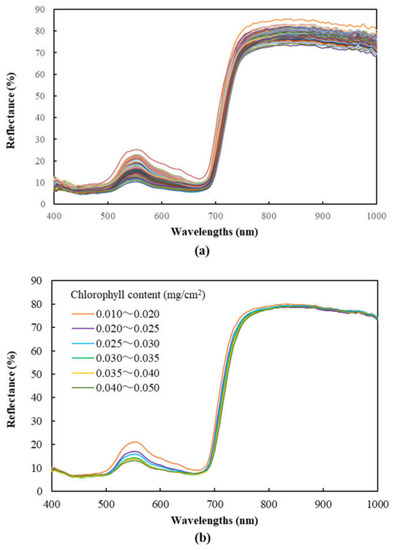 Spectral reflectance characteristics of ‘Fuji’ apple leaf samples: (a) all individual leaf samples (each line indicates the reflectance spectrum of an individual leaf sample); (b) the average of leaf sample groups with different levels of chlorophyll content.