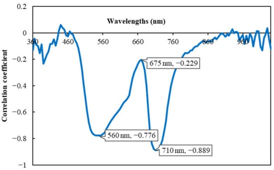 Correlation coefficients between ‘Fuji’ apple leaf reflectance at each wavelength and chlorophyll content. For all of the wavelengths, 3 characteristic wavelengths (560 nm, 710 nm and 675 nm) and their correlation coefficients are indicated in the graph: the wavelengths (560 nm and 710 nm) show the highest negative correlation with chlorophyll content and the characteristic wavelength (675 nm) represents a peak between the above 2 wavelengths.