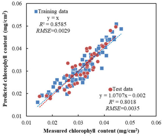 Measured vs. predicted chlorophyll content in ‘Fuji’ apple leaf samples via the MLR model based on the three key wavelengths. The dashed lines indicate the best fit lines for the training data set (blue) and the test data set (red), respectively.