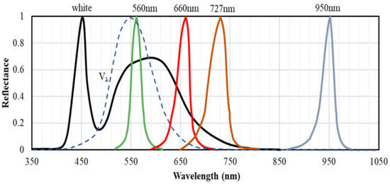 In designing the camera prototype, three LEDs, each of which emitting light at one of the three key wavelengths, were used as the lighting for the prototype. In addition, another LED at the wavelength of 950 nm was added into the prototype, which, due to its high reflectance, has always been used as a reference in the development of similar devices [56,57]. Since the LEDs 675 nm and 710 nm were not available in the market, it was recommended to replace them with the LEDs 660 nm and 727 nm that had the closest wavelengths to each of the 2 key wavelengths available in the market. Finally, the commercial narrow-band LEDs manufactured by arm-OSRAM (OSRAM GmbH, München, Germany), LP M675 (560 nm), GH DASPA2.24 (660 nm), GF DASPA2.24 (727 nm) and SFH4646 (950 nm) were purchased for the prototype development. The relative spectral emissions of the four LEDs are shown in Figure 4. Each LED emits a light with the peak at/near the key wavelength and a narrow full width at half maximum (FWHM). The emission spectrum of the white LED used in “Rice Scan” (black solid line) and the CIE (International Commission on Illumination) standard photopic luminous efficiency function Vλ (dashed line) are indicated for comparison.