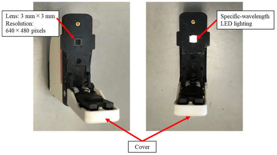 The two camera prototypes developed are shown in Figure 6 and Figure 7. The prototype is a palm-sized (70 mm height × 60 mm width × 18 mm depth) and low-weight (60 g) device, equipped with an entrance window of 3 mm × 3 mm and a CMOS sensor that can capture an RGB image with a resolution of 640 × 480 pixels for an area of 2 mm × 2 mm on the leaf sample. During measurement, a plant leaf was placed on the entrance window and the cover was put down closely on the leaf to eliminate the ambient light interference. A specific-wavelength LED was selected with the software developed in parallel, and the image was then captured under the emitted light condition.