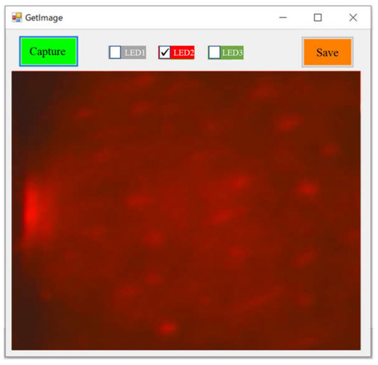 A software tool for controlling the camera prototype was designed and developed under the Visual Studio IDE environment (Microsoft Corporation, Redmond, WA, USA). Figure 8 shows the interface of the software to capture images using the camera prototype. In image acquisition, a specific-wavelength LED was first selected, and the light of the selected specific wavelength was emitted when the image was captured using clicking the “Capture” button. The captured image could be saved into a designated folder by clicking the “Save” button. The image shown in the figure was captured for a green leaf under the LED2 (660 nm) lighting condition using the Camera 1 prototype.