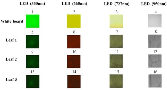 RGB images for the white board and three leaf samples captured using the camera prototypes under four different specific-wavelength LED lighting conditions. The numbers indicate the number of images taken sequentially with the cameras.