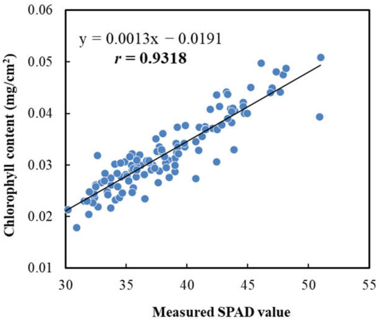 The relationships between the nondestructively measured SPAD and CCN values, and between the SPAD value and the chlorophyll content measured using a destructive, solvent-based pigment-extraction method combined with an absorption spectrometer were investigated. A significant correlation (r = 0.9318 (p < 0.001)) between the measured SPAD values and chlorophyll contents in leaves was found (Figure 10), suggesting the usefulness of the SPAD meter in evaluating the chlorophyll content in the apple leaf. This agrees with the results of numerous previous studies that have confirmed the effectiveness of using SPAD values to assess the nutrient status of a variety of plants and crops [42,43,44,50,51,52].