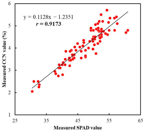 In addition, there was also a significant correlation (r = 0.9173 (p < 0.001)) between the measured SPAD and CCN values (Figure 11). Although the “SPAD meter” and “Agri Expert CCN” meter were developed for measuring the chlorophyll and nitrogen contents in the leaf plant, respectively, the results measured using these two devices were significantly correlated with each other. Similar results have also been reported in the literature and the reasons have mainly been attributed to the close relationship between the chlorophyll and nitrogen contents in the plant leaf [10,24,38,39]. Our previous study confirmed that the SPAD value not only could be used to accurately predict the chlorophyll content, but it could also be used to predict the nitrogen content in the apple leaf with reasonable accuracy [47]. Furthermore, the CCN value could be directly interpreted into the actual level of nitrogen concentration in the plant leaf [58,59,60]. Therefore, if the camera prototype developed in this research could accurately predict the SPAD and CCN values, it could potentially be used as a new tool to evaluate the nutrient status of plants and crops.