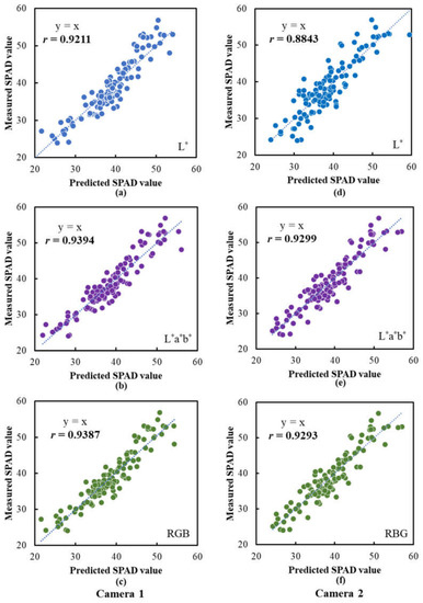 Performances of the SPAD prediction models based on the data extracted from the images captured using the camera prototypes. Scatter plots of the measured SPAD values vs. the predicted SPAD values are illustrated: (a–c) are the results for the models based on L*, L*a*b* and RGB data, respectively, for Camera 1; (d–f) are the results for the models based on L*, L*a*b* and RGB data, respectively, for Camera 2. The lines indicate the best fit lines.