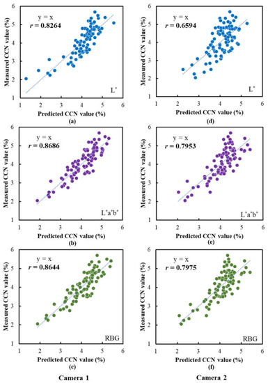 Performances of the CCN prediction models based on the data extracted from the images captured using the camera prototypes. Scatter plots of the measured CCN values vs. the predicted CCN values are illustrated: (a–c) are the results for the models based on L*, L*a*b* and RGB data, respectively, for Camera 1; (d–f) are the results for the models based on L*, L*a*b* and RGB data, respectively, for Camera 2. The lines indicate the best fit lines.