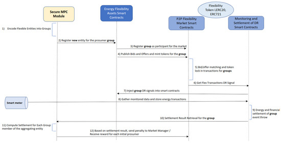 In this section, we start with a short outline of the P2P energy flexibility market used as support for the integration of the proposed privacy-preserving methods (Section 3.1), and then we focus on the novel contribution of this paper related to the grouping and encoding the prosumers’ energy orders using secure MPC and their integration with the smart contracts facilitating the P2P trading and market operation (Section 3.2 and Section 3.3).