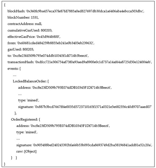 Before submitting the new orders to the market, each member of the group transfers the token amounts associated to the group smart contract. The tokens are locked in transactions until the settlement is performed. The orders are placed directly on the blockchain since the MPC-based obfuscation algorithm does not disclose information related to members of the groups created. It returns a set of buyer and seller prosumers who operate on the market. Figure 3 shows the blockchain transaction representing the group energy flexibility order and the events thrown.