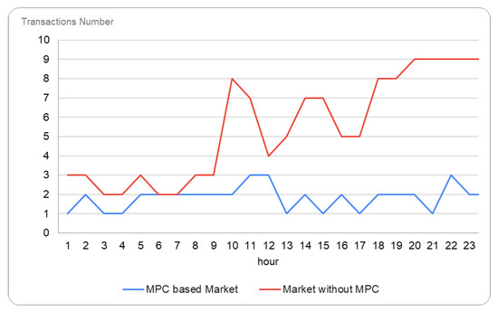 To compare our solution to an energy flexibility market with no MPC integration, we ran the same energy market but with all the prosumers acting directly on the market and going through all the market phases. Figure 7 shows the number of P2P transactions evolution in our scenario with and without the MPC-based technique. The number of transactions during a day in our scenario decreases from 132 transactions without MPC to 44 transactions with MPC, and on average from 6 to 2.
