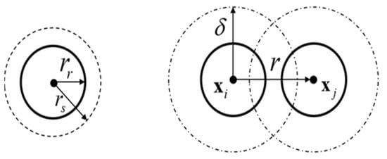 where is also called the hard-core distance of which is illustrated in Figure 1. In our case, can also be interpreted as the minimum distance between two robots, i.e., . Furthermore, the distribution of the point in over represents the partial distribution of the swarm robot over the same domain, resulting in . According to the proposed motion model, in this study, the MHC process with population density is used to describe the partial distribution of the swarm robot over . Based on the constructed partial distribution of the swarm robots, the probability of experiencing an encounter state of will be calculated.