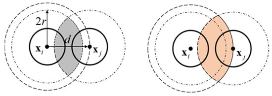 To construct the nearest neighbor distance model, a geometric function must be determined first. According to Figure 1, let be the distance between and its nearest neighbor; be the area of the symmetrical lens formed by the intersection of and ; and be the area of the asymmetrical lens formed by the intersection of and . and are illustrated in Figure 2 and can be defined as in Equations (12) and (13), respectively.