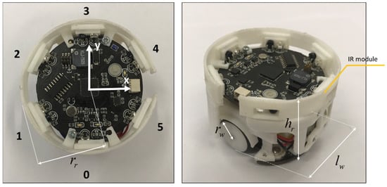 The performances of the proposed model are evaluated according to the test which is conducted in a real experiment. All tests use the same robot platform which has a top and perspective view illustrated in Figure 4. The robot platform is cylindrical in shape with a radius of 25 mm and height of 40 mm, respectively. The inter-wheel distance and radius of each wheel are 40 mm and 10 mm, respectively. Given that the robot is equipped with 6 infrared modules, as shown in Figure 4, arranged in a specific order, the maximum number of neighbors of robot , obviously is 6.