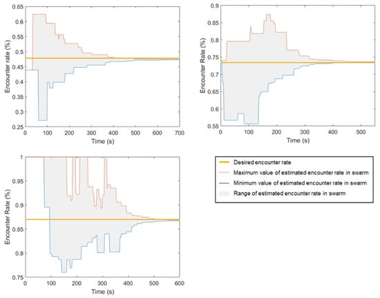 Since the swarm’s decision-making is based on the estimated encounter rate of the robots, the value that all robots converge to is crucial. Therefore, the convergence of estimated encounter rates of the swarm is first evaluated under the static swarm size. In this case, we set , i.e., the consensus process will continue to run until the experiment is terminated by the experimenter. Three experiments, in which the swarm size is set to 20, 40 and 60, are conducted to evaluate the convergence. According to Equations (11) and (16), the desired encounter rates correspond to . In order to obtain the results, a central server was set up for the task of collecting data from all robots in the swarm. Each robot was equipped with a Wi-Fi communication system previously connected to the server. The robot will continuously stream its data to the server, and the type of data collected depends on the experiment. For this experiment, robots presenting in the workspace will continuously transmit their current estimated encounter rate to the server. The results of these experiments are plotted in Figure 5.