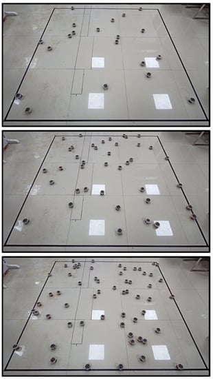 The test area for the swarm robots in this experiment is a square-shaped workspace measuring 2000 × 2000 mm2, marked by a black line to indicate the boundaries. Three infrared sensors are installed at the bottom of each robot to determine the boundaries of the work area. The message transmission process, which contains the message protocol and estimated value time of the robot, takes approximately 10 ms.