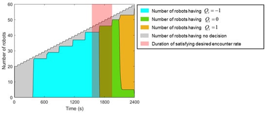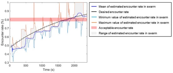 Based on Equation (16), if the desired swarm density is given, the desired encounter rate can be defined. Let be the preassigned desired encounter rate for the swarm, and let be the desired decision of the swarm, where the value of is determined based on the comparison between the current encounter rate and the desired encounter rate, as well as the threshold error .