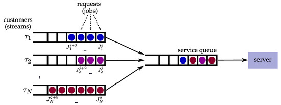 The earliest research related to systems that can tolerate the occasional loss of deadlines was the work of Hamdaoui and Ramanathan. In [5], they introduced the notion of -firm deadlines as a specification of temporal constraints in the context of scheduling messages in communication systems. More specifically, their system model consists of streams of schedulable entities, which they refer to as customers, that must be scheduled on a single server. This system model can be used to represent many computer and telecommunication systems, including multiple tasks’ execution on a CPU and the transmission of messages from multiple streams that share the same medium. Each customer has a specified deadline by which the full service of the system is expected. If the customer is not fully serviced by the deadline, it is considered that the deadline is missed. The time required for serving the customer is referred to as the service time and it is equivalent to . The service times for all streams are identical and service cannot be preempted. The minimum inter-arrival time between the requests of the customers is equivalent to the period . Therefore, each stream can be described as a task , while the customer request corresponding to a stream is equivalent to a job . For simplicity, the terms task and job are used hereafter to represent streams and the corresponding customers. Each task is assigned two parameters, m and k, which specify that at least m jobs must meet their deadlines in any window of k consecutive requests of the task. If the stated requirement is not fulfilled, the task has experienced a dynamic failure. It is worth noting that this demand implies the maximum deadline miss rate of . The described system model is depicted in Figure 2.