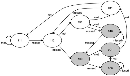 The proposed priority assignment technique can be illustrated by a state transition diagram. For example, consider a task with constraint. Figure 3 shows the state transition diagram for task . The initial -pattern is 111. The edges of the diagram represent the possible state transitions (deadline missed or deadline met). If a state does not satisfy the constraint, the task is in the failing state, which is denoted by a shaded shape. The task in the failing state is assigned a priority value of 0, i.e., the highest priority, while the other tasks are assigned a priority corresponding to the distance to the failing state. For example, a task with the -pattern 110 is assigned priority 1, while a task with the -pattern 111 is assigned priority 2.