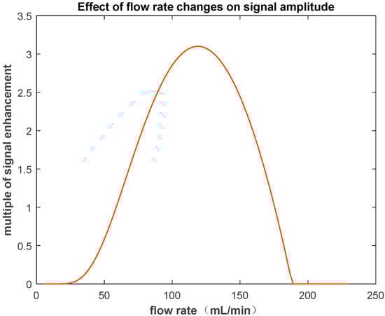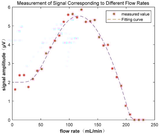 Figure 13, which illustrates the changes in the peak of the FID signal as the flow rate increased. Initially, due to the low flow rate, the polarized water sample had not yet flowed into the detection area and had already depolarized, so the measured magnetic resonance signal was the FID signal of the depolarized water sample for the 30 mT magnetic field. The detected signal was relatively weak. As the flow rate increased, the pre-polarized water sample flowed into the detection area, increasing the strength of the FID signal, and the optimal flow rate to maximize the signal could be determined. As the flow rate continued to increase, the portion of the water sample excited in the detection coil was not detected before being flushed out of the detection area, and no voltage signal was induced, resulting in a signal amplitude of zero. By fitting the measured waveform of flow rate and signal amplitude, the ratio of the signal amplitude at the optimal flow rate to the signal amplitude at rest was approximately 2.69, which is consistent with the results of the simulation analysis. Moreover, the image trend matched the physical simulation.