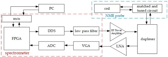 40] outputs a low-power RF signal corresponding to the Larmor frequency of the hydrogen atomic nucleus that is proportional to the strength of the magnetic field to be measured. After amplification by an RF power amplifier, the duplexers isolate the high-power RF signal and directly transmit it to the tuning and matching network of the probe, generating an RF field perpendicular to the magnetic field direction of the coil and causing the macroscopic magnetic angle deviation of the nucleus to demonstrate a nuclear magnetic resonance phenomenon. After the RF excitation dissipates, the deviated atomic nucleus slowly returns to the initial state due to the action of the static magnetic field, inducing an induced electric signal in the coil, that is, the NMR signal. This signal is amplified by the low-noise amplifier [