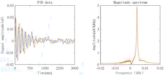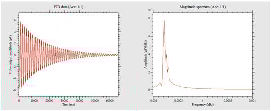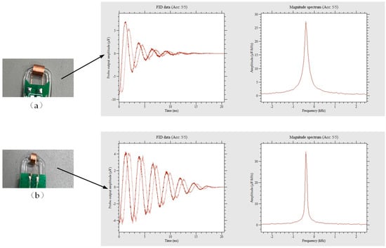 Figure 14, through the experiment, it was found that although longer coil lengths increased the signal peak of the FID signal in the time domain, the longer the probe coil length, the faster the FID signal decayed, resulting in a slower FFT spectrum peak and a smaller peak-to-width ratio. On the contrary, the smaller the probe, the slower the FID signal decayed and the sharper the spectrum. The reason is that the longer the probe coil, the wider range of magnetic fields it involves in the measured magnetic field, and the measured magnetic field is inevitably inhomogeneous. An inhomogeneous magnetic field induces signals of different frequencies in the probe, significantly reducing