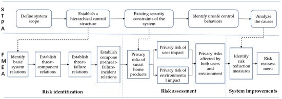 In the STPA–FMEA approach, incidents are viewed as caused by the presence of insecure controls or constraints at various levels of the control structure during the system development and operation phases. This means that the potential failure modes, the effects of system components, and the interactions of user-product-environment control effects should be considered, while assessing the privacy risk of smart home systems using the STPA–FMEA method. Based on the basic process of the FMEA method, this study introduces the STPA theory at each stage of risk assessment to provide a more comprehensive and improved assessment of system privacy risk. A specific process for risk assessment was developed, according to the privacy risk characteristics of smart home systems, by integrating risk management frameworks (risk management principles and guidelines) into the STPA–FMEA method.