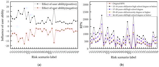 RPN of privacy risk under users’ effects. (a) Impact of user capabilities on RPN, (b) RPN for risk scenarios under different types of users. As shown in Figure 4a, the three risk scenarios in which user capabilities have the greatest impact on risk valuation are as follows: A5, in hardware systems, firmware logic vulnerability caused by physical security failures can result in losses. C1, in communication systems, insufficient authentication caused by control mechanism failures can result in remotely manipulating terminals. A8, in hardware systems, the lack of side-letter channel protection caused by physical security failures can result in losses. As shown in Figure 4b, the risk values of the four categories of users differ significantly under different risk scenarios, meaning that users of different ages and education levels have a significant impact on the risk profile. Users with higher privacy management capability (age 29–45, education bachelor’s degree or above) face lower privacy risk when using a smart home, but users with lower capability (age 12–16, education junior high school or below) face higher privacy risk.