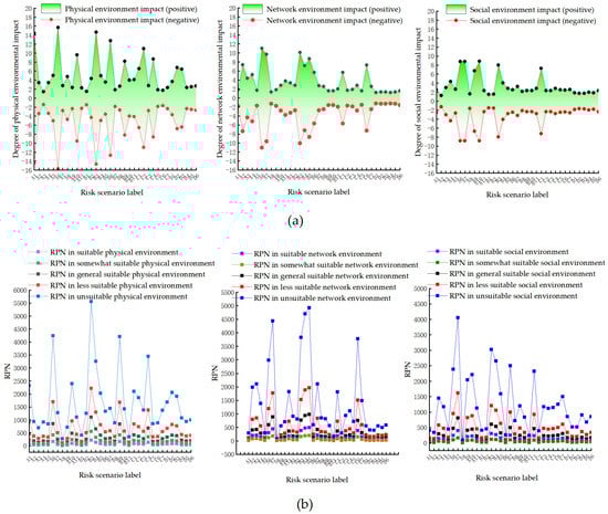 RPN of privacy risk under environmental effects. (a) Impact of environment on RPN, (b) RPN for risk scenarios in different environments.